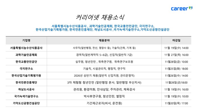 취업 포털 커리어가 서울특별시농수산식품공사, 과학기술인공제회, 한국교통안전공단, 극지연구소, 한국산업기술기획평가원, 한국언론진흥재단, 하남도시공사, 국가녹색기술연구소, 가덕도신공항건설공단 채용 소식을 17일 발표했다.