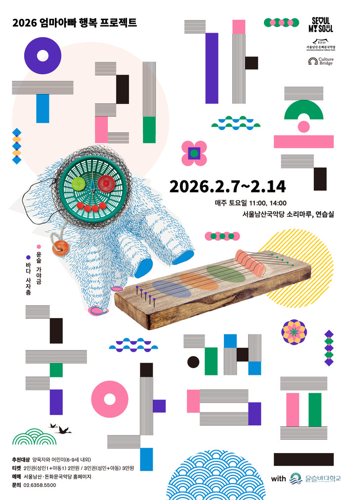 엄마아빠 행복 프로젝트 ‘우리가족 국악캠프’의 주요 대상은 양육자와 어린이로, 어린이 권장 연령은 6~9세다. 티켓은 2인권 2만원, 3인권 3만원이며, 보다 자세한 내용과 예매는 서울남산·돈화문국악당 누리집을 통해 확인할 수 있다.