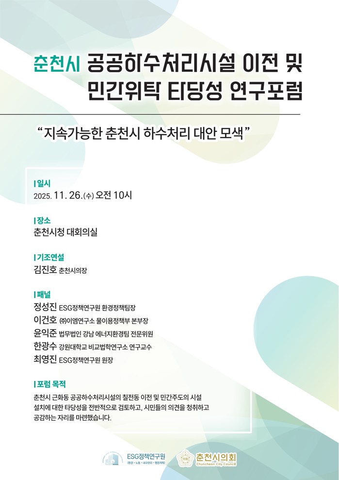 ESG정책연구원은 오는 11월 26일(수) 오전 10시 춘천시청 대회의실에서 ‘춘천 하수처리 민간위탁 타당성 시민포럼’을 개최한다.
