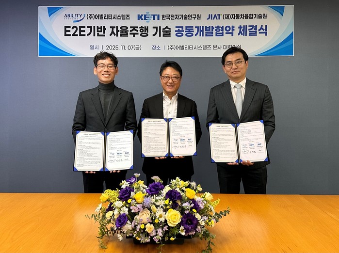 어빌리티시스템즈는 한국전자기술연구원(KETI) 인공지능연구본부, 자동차융합기술원 모빌리티연구본부와 지난 11월 7일 어빌리티시스템즈 본사에서 E2E 기반 자율주행 기술의 연구개발 및 실증을 공동으로 추진하기 위한 업무협약(MOU)을 체결했다고 밝혔다.